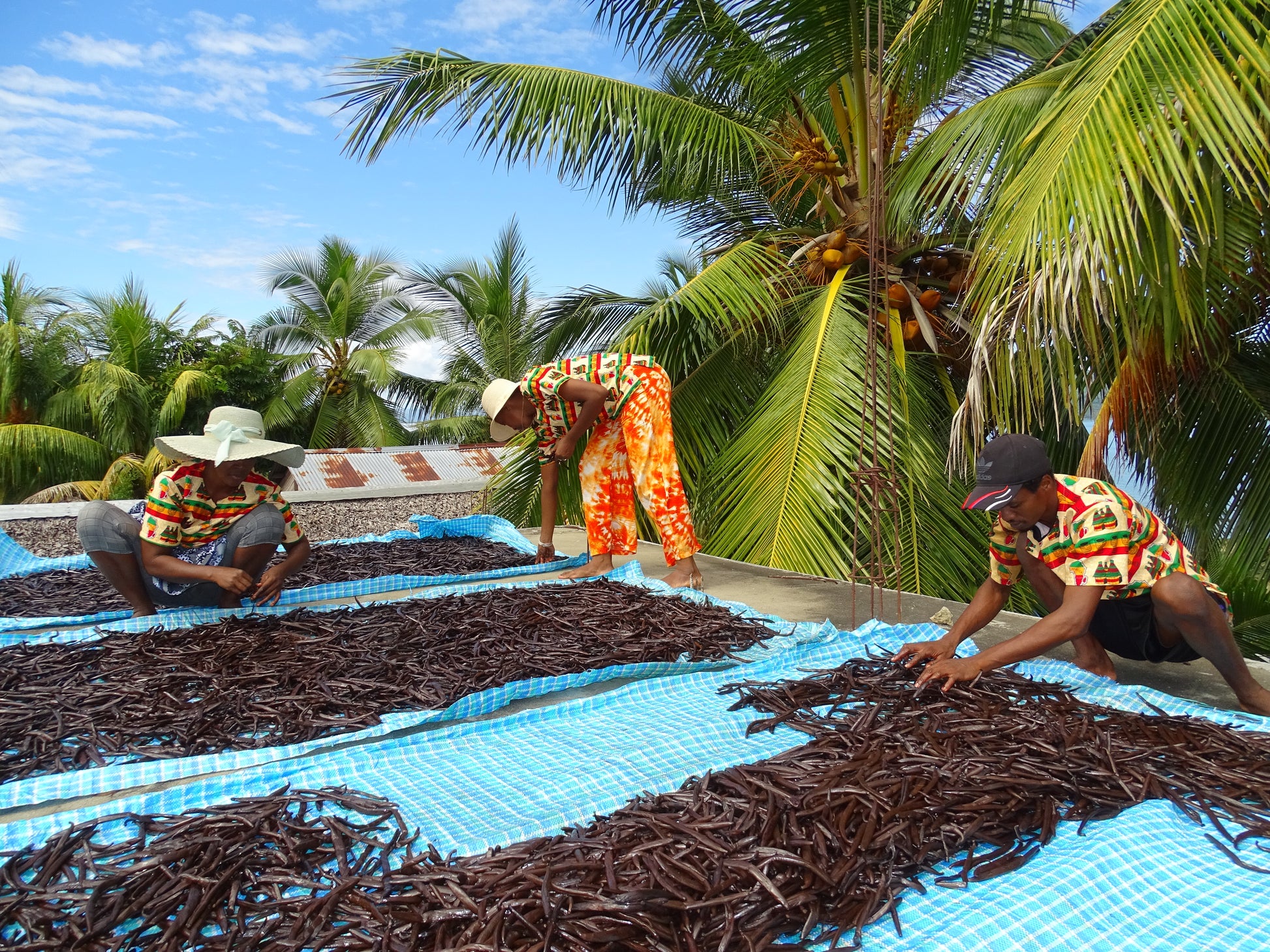 By our exercise of complete and clear control (auditable and accountable and actually visible onsite,) we optimize flavor, form, and vanillin development over the life and course of orchids' hand pollination ("bourbon method") all the way to the mature pod cutting over the "green season,"...to the water searing/killing ("ranomafana,") the sorting ("triage/calibrate,")... to the sunning and scheduling of the curing windows and wax paper packing...to exit the island in stellar shape with an in-house export license and small laboratories.