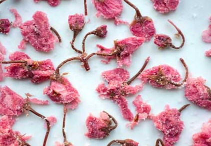 After harvesting, sakura cherry blossoms are preserved by pickling them with salt and plum vinegar. This helps to keep their pink color which lasts for a long time. Each flower is carefully preserved and processed to maintain its shape, aroma, and beautiful petals.
